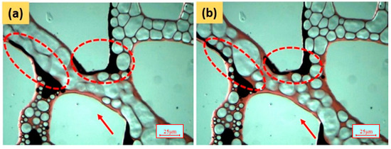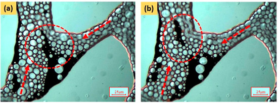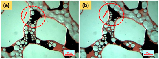 Pore-scale images of the residual oil droplets pushed by the gas bubbles. (a) 0.105 PV; (b) 0.124 PV.