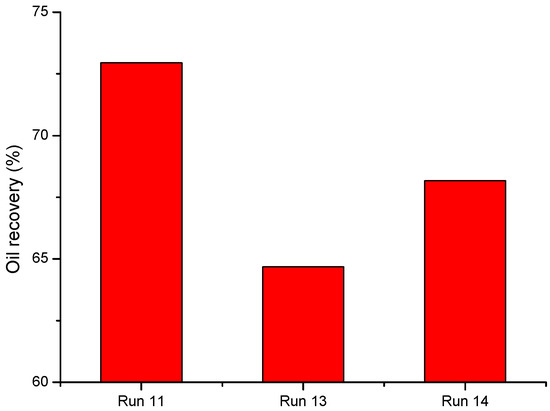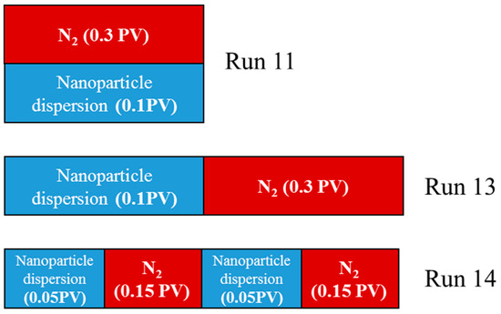 To study the effect of the injection pattern on the recovery performance of nanoparticle-surfactant-stabilized foam flooding, three flooding tests (Runs 11, 13–14) were conducted by different injection patterns. The foam slug size and GLR were set to be 0.4 PV and 3:1, respectively. The nanoparticle SiO2 dispersion slug and N2 slug were injected through different patterns, as shown in Figure 34. For Run 11, the 0.3 PV N2 slug and 0.1 PV nanoparticle dispersion slug were injected into the sandpack simultaneously. For Runs 13 and 14, the nanoparticle dispersion slug was injected firstly, and then the N2 slug was injected. The nanoparticle dispersion slug size of each injection was 0.1 PV and 0.05 PV, respectively. Figure 35 shows the oil recovery for each test. It can be seen that the oil recovery of the test with the co-injection pattern (Run 11) was higher than that of the test with the nanoparticle dispersion alternating N2 injection pattern (Runs 13 and 14). For the nanoparticle dispersion alternating N2 injection pattern, the oil recovery of Run 14 is higher than that of Run 13. This indicates that the recovery performance of the nanoparticle stabilized foam flooding was better with a more frequent cyclic slug. Therefore, the injection pattern is recommended to select the N2 and nanoparticle dispersion co-injection pattern.