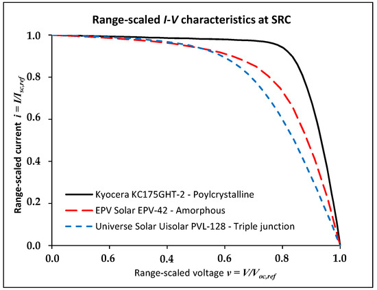 where, following the traditional theory, photocurrent IL depends on the solar irradiance and diode currents I01 and I02 are affected by the cell temperature. Due to the large number of parameters used, the two-diode model is supposed to be fit to adequately represent any I-V characteristic, regardless of the shape peculiarities due to the different production technology of the simulated PV panels. Actually, because the production technology affects the shape of the I-V characteristics, crystalline silicon and thin-film PV cells and modules have very different performance curves. As depicted in Figure 2, in which the range-scaled I-V characteristics at the standard rating conditions (SRC)—irradiance Gref = 1000 W/m2, cell temperature Tref = 25 °C and average solar spectrum at AM 1.5—of some types of PV modules are compared, the crystalline PV modules show an I-V characteristic with a very sharp bent, whereas the thin-film modules are generally characterized by smoother I-V curves.