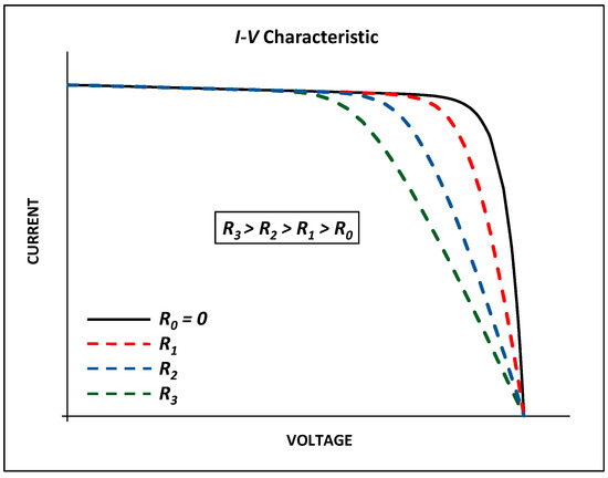 The series resistance impacts the shape of the I-V characteristic close and beyond the maximum power point (MPP), which is approximately set on the “knee” of the curve; the shunt resistance modifies the I-V curve for values of the voltage that are smaller than the MPP voltage. As depicted in Figure 5, the presence of the second diode saturation current modifies the curvature of the I-V characteristic close the MPP.