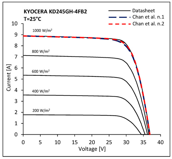 Comparison between the issued I-V characteristics of Kyocera KD245GH-4FB2 at T = 25 °C and the characteristics calculated by means of the Chan et al. models.