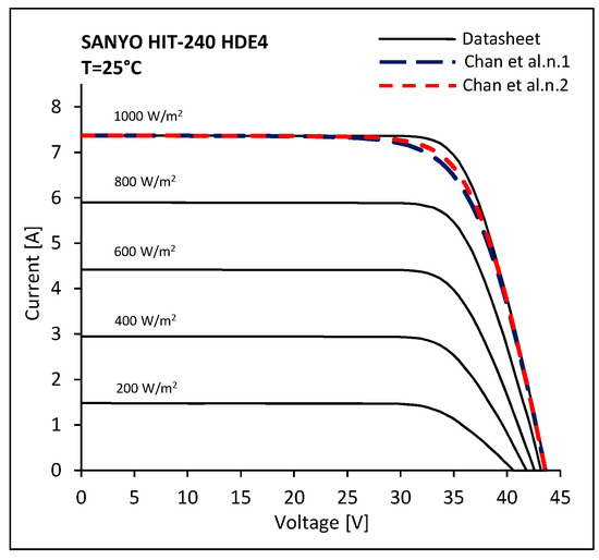 Comparison between the issued I-V characteristics of Sanyo HIT-240 HDE4 at T = 25 °C and the characteristics calculated by means of Chan et al. models.