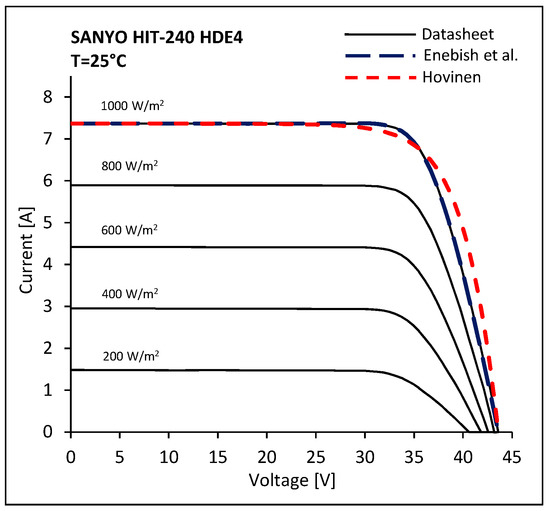 Comparison between the issued I-V characteristics of Sanyo HIT-240 HDE4 at T = 25 °C and the characteristics calculated by means of Enebish et al. and the Hovinen models.