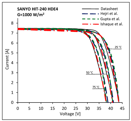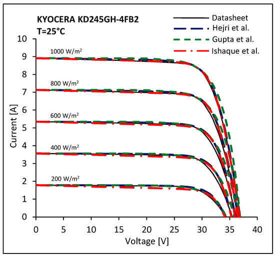 The Enebish et al. model results very accurate for both Kyocera and Sanyo PV panels. The Hovinen model, which is very accurate for the Kyocera PV module, shows a lack of precision for the Sanyo PV panel. The Chan et al. models results less effective close the MPP of the simulated PV modules. In Figure 10 and Figure 11 the I-V curves evaluated at T = 25 °C using the models of Ishaque et al., Gupta et al. and Hejri et al. are compared with the characteristics issued by manufacturers. Figure 12 and Figure 13 depict the I-V curves evaluated at G = 1000 W/m2 and the characteristics issued by manufacturers.