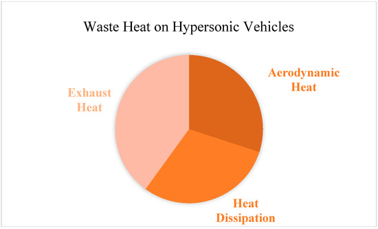 The waste heat on a hypersonic vehicle is any heat source that is not utilized effectively, such as the aerodynamic heat and the heat dissipated on engine walls. The total temperature of the inlet airflow caused by the hypersonic flight in a hypersonic vehicle is extremely high. The steady-state temperature of the leading edge can reach almost 1927 °C (2200 K) and the temperatures of the other parts are about 1093 °C (1366 K), for a Mach number of 8 [2]. Besides, the wall temperature and the wall heat flux of the propulsion system, which may be a scramjet [3] or combined cycle engines, like the Turbine Based Combined Cycle (TBCC) [4] and the Rocket Based Combined Cycle (RBCC) [5], are also extremely high. Hence, these high temperatures are a technical challenge for hypersonic flight from the point of thermal protection, but the high temperature and the high heat flux can also be treated as the heat source for an electricity generation system. Heat sources with different temperatures, namely different energy levels [6], can be utilized to generate electricity through different thermodynamic cycles, or other thermoelectric conversion technologies, such as the use of semiconductor thermoelectric generators (TEGs).