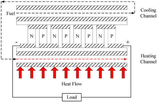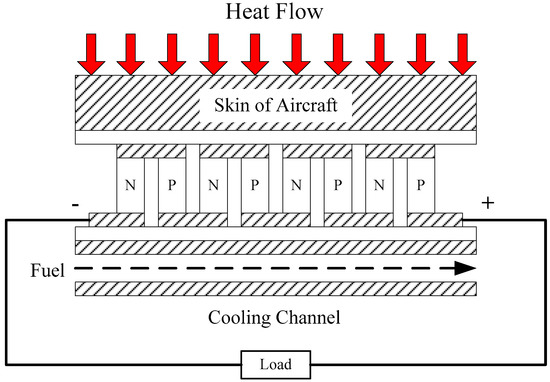 Considering the heat transfer rate of a thermoelectric device is not high enough to influence a heat resource with a quite high heat flux, the temperature of some heat sources, such as the aerodynamic heat on the leading edges of aircraft, can be treated as a constant. A sketch of a thermoelectric generator with an isothermal heat source is shown in Figure 2. The heat source of the thermoelectric device is the aerodynamic heat coming through the skin of aircraft, and the cold source for the system is the fuel carried by the hypersonic flight vehicle, which is always treated as the only coolant for a hypersonic flight [38]. A number of thermoelectric couples located between the skin of the aircraft and the cooling channels are connected in series. The temperatures of the hot junctions can be kept as an approximately constant value because the influence of the thermoelectric device on the temperature distribution of skin is extremely small. To avoid the issue of thermal cracking of the endothermic hydrocarbon fuel, the fuel is set as hydrogen in this paper for convenience of calculation.