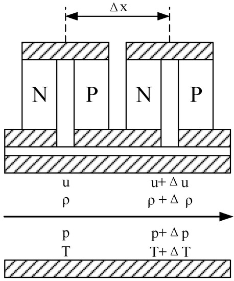 The governing equations in the cooling channels are the same as the equations for the thermoelectric generator model with an isothermal heat source, and the equation of conservation of energy and the equation of state in the heating channels are as follows: