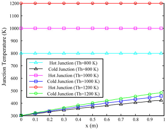 The temperature distribution in the x direction with different hot junction temperatures under the maximum thermoelectric efficiency is shown in Figure 6.
