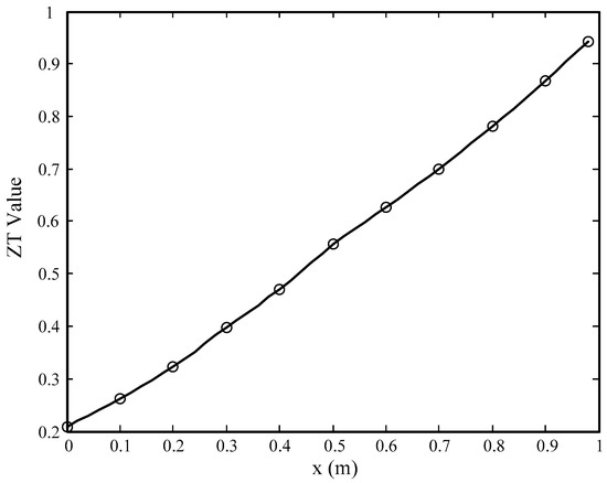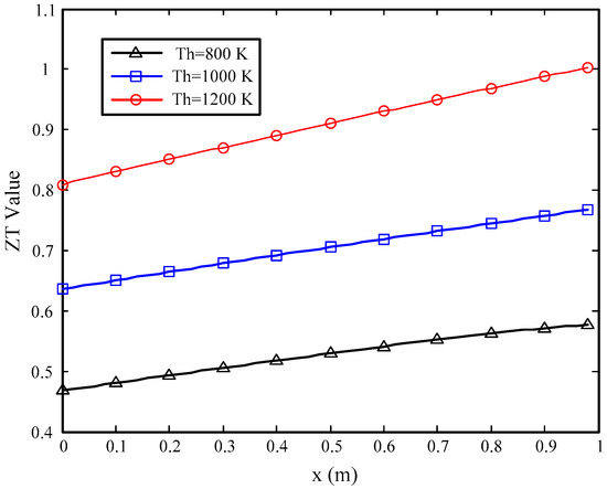 The temperatures of the cold junctions improve along the x direction because of the temperature rise of the fuel in the cooling channels. Meanwhile, the temperatures of the cold junctions increase with the hot junction temperature because of the larger heat flow caused by heat conduction, according to the Fourier law. The growth of the cold junction temperatures is far smaller than the increase of the hot junction temperatures, which means the temperature difference between hot junction and cold junction, one of the main factors to Seebeck effect, improves with the hot junction temperature, too. This is one of the reasons why the thermoelectric efficiency improves with the hot junction temperature. Another reason is that the ZT value, which is always applied to evaluate the thermoelectric efficiency for TEGs, increases with the rise of hot junction temperature as shown in Figure 7, and the ZT value improves along the x direction at the same time. Note that the figure is drawn under the maximum thermoelectric efficiency. The main reason for the increase of ZT value is the improvement of the average temperature of the thermoelectric couples, considering the variation of physical properties with temperature is quite small for the models applied in this paper. The maximum ZT value is approximately 1 for a hot junction temperature of 1200 K, and the maximum value is lower that 0.6 with a hot junction temperature of 800 K. This means that the hot junction temperature has a huge impact on the ZT value for thermoelectric devices with isothermal heat sources.