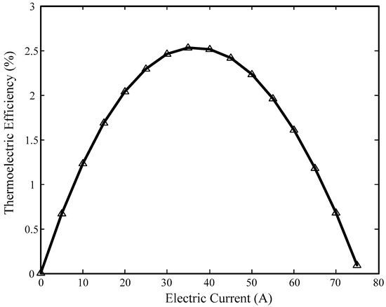 For a thermoelectric device with an isothermal heat source, the variation of thermoelectric efficiency of the electric current with different hot junction temperatures is shown in Figure 5. There is an optimal electric current point with a maximum thermoelectric efficiency for each hot junction temperature, because the electric power output of TEGs will decrease under too large a current or too low a current, like a battery. The Peltier heat of hot junctions, which is the main heat input for TEMs, will be small if the current is quite low. Meanwhile, the Joule heat, a power loss for electricity generation, will be too large if the current is too high. The thermoelectric efficiency increases with a higher hot junction temperature because of the larger temperature difference between the hot junction and cold junction and a greater ZT value. The details will be discussed below. The maximal thermoelectric efficiency moves to higher currents as the temperature rises, because the amount of Peltier heat is larger at a higher hot junction temperature, which makes the maximal efficiency current higher. The maximum thermoelectric efficiency can reach 5% under a hot junction temperature of 1200 K when the electric current value is about 60 A.