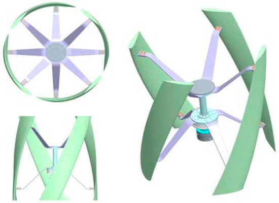 The HVAWT studied in this paper is shown in Figure 1. It consists of four helical blades with NACA0018 profile, and a blade phase angle change of 70 degrees was adopted. The shaft and blades are connected together by several welded arms, so that the energy could be smoothly transferred from the blades to a generator. In this study, the arms and shaft were simplified in order to focus on the behavior of the blades as well as reduce the meshing difficulty and computational resource demands. Some of the main geometrical parameters are listed in Table 1.