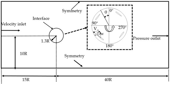 The computational domain and boundary conditions are shown in Figure 2. In order to eliminate the inlet effect as well as to obtain a fully developed wake flow, the computational domain in front of and behind the HVAWT were extended 15R and 40R, respectively. The inlet velocity is 9 m/s in this paper, and the rotational speed varied with different TSR condition. The whole domain was divided into two zones; the rotational inner zone, and the stationary outer zone. These two domains were connected together by a non-conformal interface. To achieve more accurate data transmission, sliding mesh method was applied to this interface rather than moving reference frame (MRF) method for unsteady simulations.