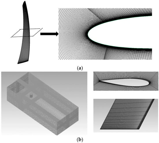 The mesh adjacent to the blade. (a,b) represent the mesh applied in 2D and 3D simulation respectively.
