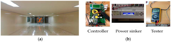 Experiment rigs in the wind tunnel. (a,b) represent the wind tunnel and measuring devices respectively.