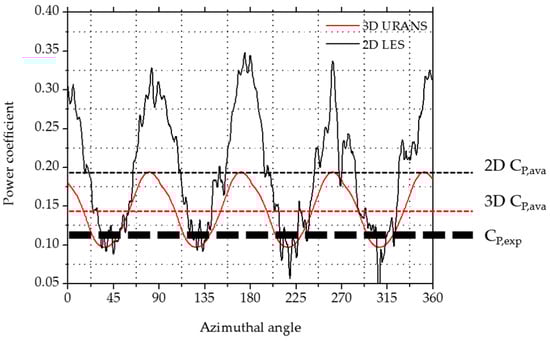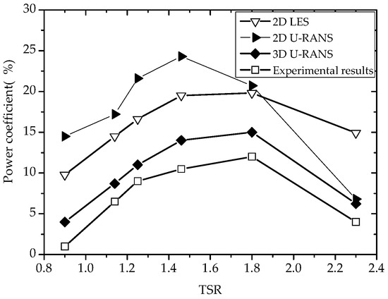 Power coefficient results derived by 2D LES and 3D U-RANS methods for = 60,800, TSR = 1.46.