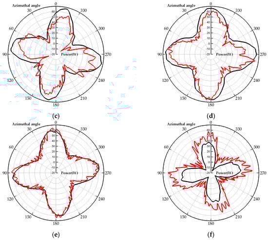 The power output at different TSR conditions, (a–f) represent 0.9, 1.14, 1.25, 1.46, 1.8, 2.3 TSR λ respectively, red line and black lines represent the 2D LES and U-RANS results, respectively.