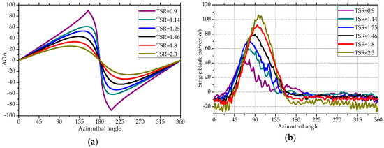 (a,b) represent the angle of attack and power output of single blade along one revolution under different TSR conditions respectively.