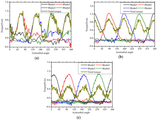 Instantaneous torque generation of each blade during one revolution; subfigures (a–c) correspond to the results at 0.9, 1.46, 2.3 TSR, respectively.