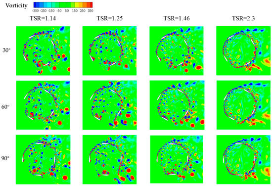 In order to study the reason for the power differences at different TSR conditions, the vertical vorticity distributions are shown in Figure 10. The positive data corresponds to counterclockwise rotation. In the azimuthal range from 0° to 180°, the wind flow can be divided into four periods, namely attached flowing, separated flowing, vortex detaching and reattached flowing as shown in Figure 11.