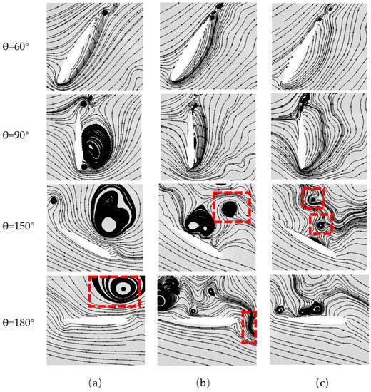 The streamlines at 60°, 90°, 150°, 180°, (a–c) corresponding to the results at TSR 0.9, 1.46 and 2.3 respectively, red frames represent the wake vortex generated from another blade.