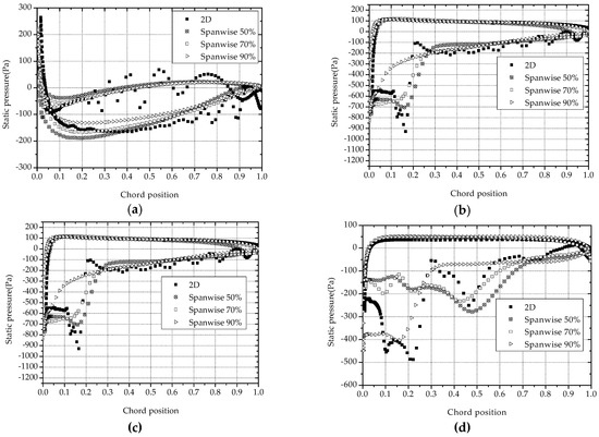 Pressure distribution along blades at different height positions at TSR 1.46, (a–d) corresponded to 30°, 60°, 90°, 120° respectively.