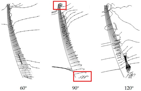 As for 50% spanwise section, because of the symmetric structure, little differences of pressure are found between 2D and 3D results, except for the results at 120° azimuthal position. It can be explained by the streamlines showed in Figure 17. At the 120° azimuthal position, the upper parts of blades are under severe stall conditions according to the AOA shown in Figure 8a, and then generate a high-pressure zone at the dynamic stall region as shown in Figure 18. The flow around middle section is forced to head down due to the vertical pressure differences, which is also called second flow, and then cause a distortion of upwind airfoil to much thinner shape. As for the 90% span-wise position, even though it confronts the same situation as it at 50% height position, however, because of the limited length left upper, the dynamic stall region is counteracted by the tip vortex significantly, thus flow in the 85% spanwise position can still keep parallel to the horizontal plane, thus maintaining a stable power output.