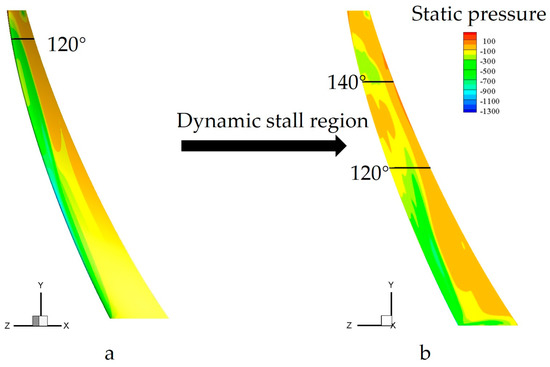 Pressure distribution at inner blade surface, (a,b) represents the results when the 95% and 50% span-wise plane reached 120° azimuths, respectively.