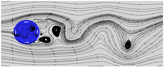 It is shown in Figure 9 that the power output in one revolution does not strictly follow the 90° cycle as predicted for the HVAWT with four blades, especially adopting a higher TSR. This is because when TSR is increased gradually, the flow field of the HVAWT becomes more like the flowing around a rotating cylinder, and a wake vortex shedding pattern is observed as shown in Figure 19. The unstable flow is introduced by the wake vortex and combined with the original flowing with 90° cycle to form the real flow field. Therefore, the effect of the shedding wake vortex on the aerodynamic performance should be studied to get more accurate estimation of a HVAWT performance.