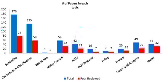 The label Borderline (176) papers are potentially relevant for this review; it is not possible from the abstract to conclude if the papers utilize smart meter data or not. Consumption Classification (135) through application of smart meter data. Economic (3) papers are concerned with grid level business models. Meter Control (58) is research regarding smart meter development, control systems and data management. Non-Intrusive Load Monitoring or NILM (42) studies how to identify individual appliances and other electric components operated in households through application of smart meter data. Not Relevant (19) papers are concerned with health meters, transmission protocols and standards and do not necessarily utilize smart meter consumption data. Policy (9) papers address issues about tariff policy and qualitative behavioral studies. Privacy (20) papers are focused data security and privacy. Smart Grid Analytics (49) are related to the entire distribution and transmission infrastructure. Water (41) applies smart meter readings to water consumption. Figure 1 shows the distribution of the distinct categories and the number of peer-reviewed material in each.