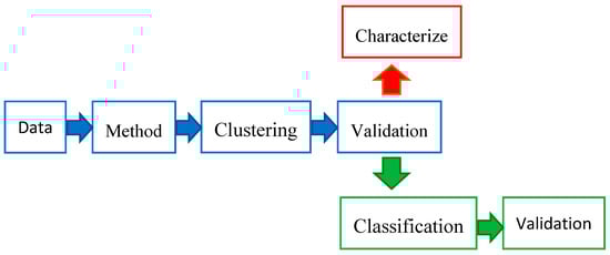 The evaluated papers roughly follow the modelling structure outlined in Figure 2. Blue indicate the elements all papers undergo; Describing the data from meters and applicable external data. Method selection, dim reduction and classification algorithms. Clustering of the meter data and validation of the clusters to select optimum classification [10].