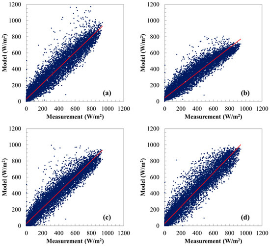 Scatterplots of direct normal irradiance (DNI) measurements and estimations, in which the red curves represent the linear regression fits: (a) Vignola; (b) Lee; (c) Reindl-2; and (d) Maxwell.
