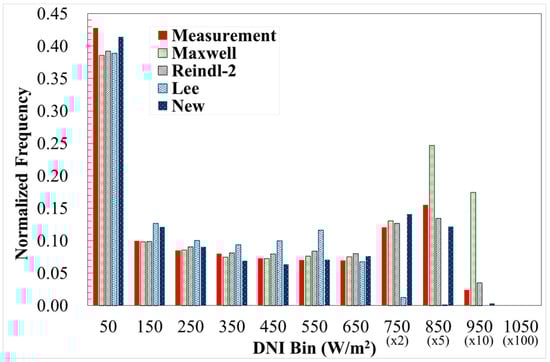 The third group includes the Reindl-2 and the Maxwell models. These models estimate DNI values larger than those measured, but they do not pose extreme behaviors, in contrast to those in the first and the second groups. Lave et al. [23] demonstrated that the Reindl-2 and the Maxwell models use the term of (via air mass in the Maxwell model) in addition to and, thus, they outperform other models that use only, which is consistent with this study. The observation frequency, normalized by dividing with the total number of data points, was calculated according to the level of the DNI. Histograms of the normalized data shown in Figure 2 indicate that the Reindl-2 model suitably estimates the observation frequency of DNI values in each DNI bin. On the other hand, the Maxwell model tends to overestimate DNI values in the bins from 750 to 950 W/m2. However, when the scatterplots in Figure 1c,d are compared, it is clear that with the Reindl-2 model the DNI is occasionally estimated too high.