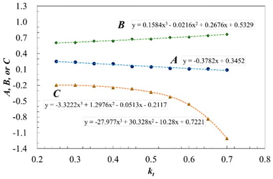 The similar regression analyses (not presented) to determine the coefficients A, B, and C were repeated at each interval of until . Note that Maxwell [13] presented the regression analyses up to because was not available in the solar radiation data from Atlanta. For Daejeon, Korea, there are some solar radiation data even when , but they are not enough to derive statistically meaningful fits. The reason is that the solar radiation in the southeastern region of the US is more abundant than in Northeastern Asia. After the coefficients A, B, and C were determined at each interval of , another regression analysis was carried out in order to fit A, B, and C as a function of . The development procedure can be summarized as follows: