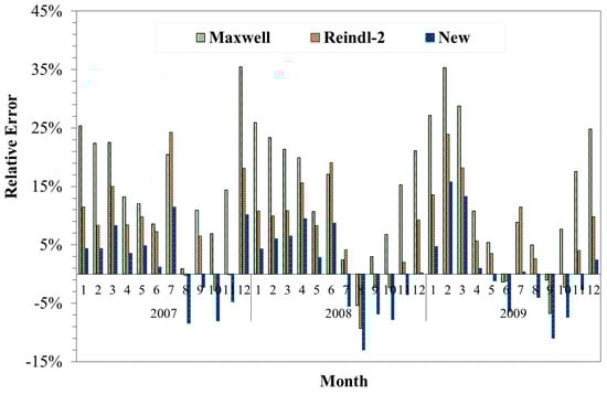 As summarized in Table 2, the error of the yearly sum of DNI supports that the new model remarkably improves estimation performance. For all three years—2007, 2008, and 2009—the error in estimation does not exceed 1.5%. Figure 6 shows variations of errors for estimating the monthly sum. In general, the new model leads to smaller errors compared to the Maxwell and the Reindl-2 models. The largest error for the Maxwell model is 35.5% in February 2009 and 24.3% for the Reindl-2 model in July 2007. However, the largest error for the new model is only 15.7% in February 2009. Errors are remarkably decreased around the winter and the spring seasons, whereas they are increased in several months of the summer and the autumn seasons. The new model tends to estimate DNI values smaller than the Maxwell and the Reindl-2 models regardless of the month, thereby resulting in the overall downward shifts of monthly errors in Figure 6. In order to investigate the effects of seasonal positions of the sun, the hourly errors in June 2009 and December 2009 against the solar zenith angle, , are presented in Figure 7. The smaller estimation by the new model is essentially independent of , which is generally true for the non-presented months as well. Consequently, it can be concluded that the underestimation of the new model consistently occurs throughout a year and contributes to decreasing the largest monthly error. Since the months where errors are decreased dominate those where errors are increased, performance in the yearly estimation is improved. In spite of better estimation in yearly irradiances, caution must be paid when the new model is applied for estimating monthly irradiances around the summer and the autumn seasons.