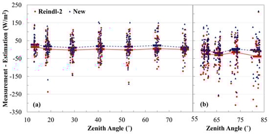 Effects of the solar zenith angle on errors for estimating the hourly DNI, in which the dotted and the solid lines indicate the averages of the Reindl-2 and the new models in each separate interval of the solar zenith angle, respectively: (a) June 2009; and (b) December 2009.