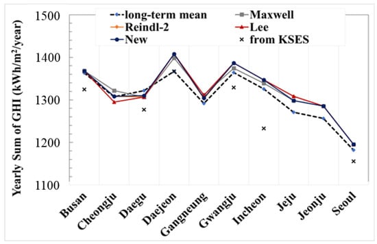 Yearly sums of the GHI from the long-term mean, in the TMY data from Korean Solar Energy Society (KSES), and in the TMY data generated using the Maxwell, the Reindl-2, and the new models.