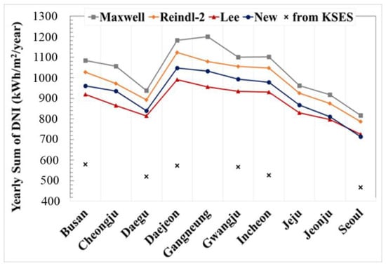 Figure 9 shows the yearly sums of the DNI in the TMY datasets. Compared to the GHI in Figure 8, the DNI variations by solar radiation model are increased. The Maxwell model estimates larger values by 18% on the average of the ten cities than the Lee model, while the Reindl-2 and the new models estimate larger values by 11.5% and 4.6%, respectively. The reverse order of the MBE values in Table 1 out of the Maxwell, the Reindl-2, the new, and the Lee models is consistent with the order of lines in Figure 9 (MBE is defined as measurement minus estimation). When the monthly sums of the DNI were analyzed for the nine other cities of Korea, similar seasonal variations due to solar radiation models were observed, as demonstrated in Figure 6. The consistent observations made with the nine other cities imply that the results based on the city of Daejeon should be applicable over the whole country. Meanwhile, the TMY data from KSES largely underestimate the yearly sums of the DNI such that they range from 53.8% to 65.5% of the counterparts from the new model. If the TMY data from KSES are used in energy simulation, the simulation results will not account for DNI effects properly.