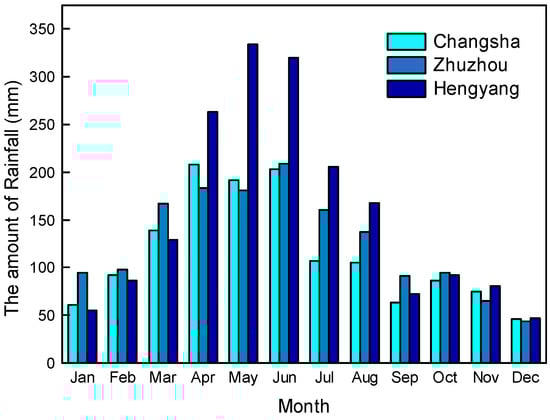 To decide the effect of rainfall, the major sources of pollution around the test area, and the pollution level were considered. In this condition, the He-Yun II line, Xing-Yun line, Chuan-Gu I line, and Gu-Xing I line were firstly selected (shown in Table 2). Figure 2 indicates the average air quality index for every month, which includes the main air pollutant, particulate matter (PM10), followed by SO2, and 30% of the total months from 2011 to 2015 reach or exceed the level of slight pollution. As shown that the air quality is very serious in the winter season and the rainfall in the wet summer season helps to clear up the air pollution. The test sites are situated in South China, and it has four distinct seasons: a significant amount of rainfall at the end of spring and the beginning of summer (the rainy weather reached more than 800 days); and drought at the end of summer and autumn. Figure 3 shows the average amount of rainfall for every month in 2011–2015. Illustrated in the figure, the main rainy season lasts from April to October, while the dry season is from November to January of the next year (this data come from the local meteorological statistical departments). The weather in spring (February, March, and April) is changeable and wet; more sunny days in summer (May, June, and July) and autumn (August, September, and October). The annual average temperature in Hunan is about 17 °C (63 °F).