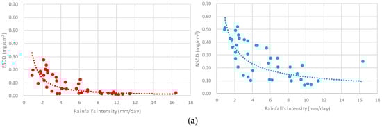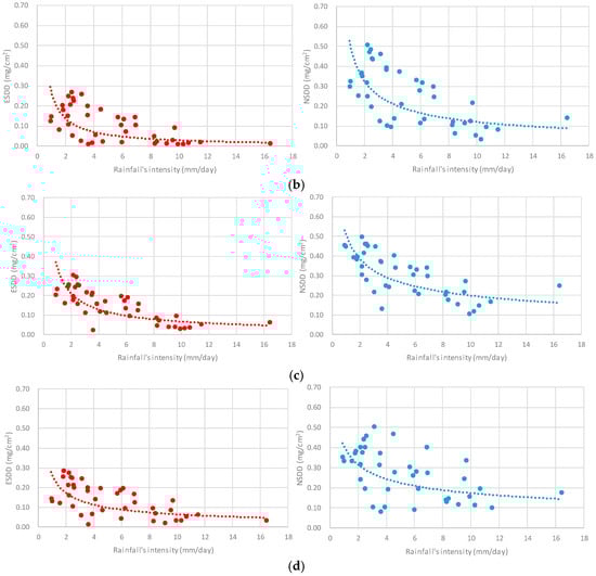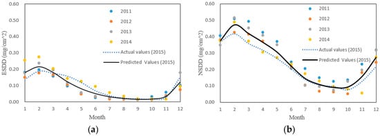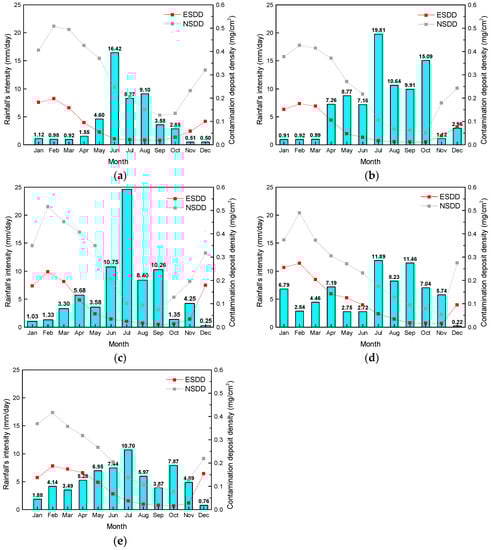 In Figure 4a–e, the ESDD and NSDD reach the peak value (ESDD/NSDD maximum data from Table 3) in February during the period from 2011–2015. At the same time, the rainfall intensity is very small (about 0.91 mm/day~4.0 mm/day) in this month. Then, the wet season (starts from March) comes and the extreme value of the average monthly rainfall intensities appears in June or July. The value of ESDD reaches the lower level (about 0.015 mg/cm2) in these months. However, the NSDD does not reach the least value, it still decreases until the rainy season is over in September or October. The least NSDD value is 0.05 mg/cm2~0.12 mg/cm2.