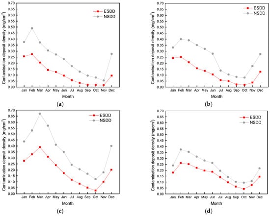(1) Based on the historical meteorological data, monthly equivalent salt deposit density (ESDD), and non-soluble deposit density (NSDD) measurements taken over a period of five years, the contamination accumulating on the surface of insulators presents seasonal changes: contamination accumulates in the dry season (January–April) and is washed off in the wet season (June–October).