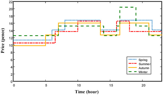 In this paper, a hybrid energy storage system has been designed for a detached domestic building in the UK of approximately 30 years in age, occupied by four people. Daily electricity consumption in this building was randomly generated by the CREST electricity model [21]. The model was used to generate 50 sets of load data for each month to produce realistic averages. Daily heat consumption in this building was generated by the model developed by Strathclyde University [22]. The gas price is based on current UK domestic gas price which is around 5 pence/kWh, and the electricity tariff is obtained from [23], which proposes a dynamic system of tariffs that vary on a half hourly timescale. The daily electricity price in each 30 min for different seasons is shown in Figure 1.