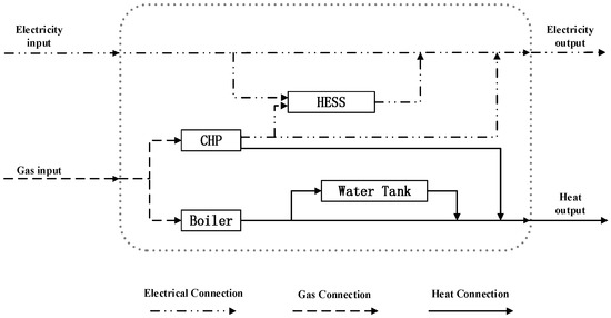 Compared with the conventional building, in this building, electricity can be obtained directly by the grid, and heat can be obtained from the gas grid via a boiler which burns gas to generate heat with the overall heat efficiency is assumed to be 88% [24]. Adding a high cost, high efficiency energy generator—a micro-CHP unit—in the building represents the main distinction from a conventional building. There are three main types of micro CHP technologies: Stirling engine CHP, internal combustion engine CHP and fuel cell CHP. All of them can utilize primary energy for power generation to cover domestic electric demand according to the principle of cascade utilization of energy. Meanwhile, the waste heat produced in the progress of power generation will be recovered for supplying heat demand. Even though it consumes gas, the high output efficiency by virtue of co-generation makes it a promising technology for increasing overall household energy efficiency. Compared to renewable energy, CHP is more stable and controllable, and moreover it can generate heat and electricity simultaneously. In this paper, the rated power of CHP is 3 kW, the heat efficiency is 66% and the electricity efficiency is 22% [25].