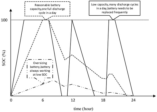 In (7), n is the number of full discharge cycles in a day. This is usually equal to 1, but in some extreme cases, n can be very large (for example, if the battery installation capacity Qb is very small) although this is not practical for a building level HESS so high n values will not be considered. SOC = peak% is the maximum SOC that the battery can reach. When the battery capacity increases beyond a certain point, the battery cannot be fully charged and will always work at a relatively low SOC, which will increase daily effective battery capacity consumption. Figure 3 demonstrates how battery capacity affects the system operation.