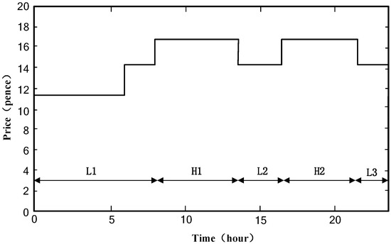As shown in Figure 1, in each season, there are two high electricity price periods and three low electricity price periods every day. (In this paper, the low electricity price periods are defined as the time periods whose electricity prices are generally lower than the highest electricity price periods. Therefore, within a low electricity price period, electricity prices can be different.) These five time periods can be defined as: H1, H2, L1, L2 and L3, and are shown in Figure 4. Since low price periods cover any tariff lower than the highest price there are both low and medium tariffs in L1.