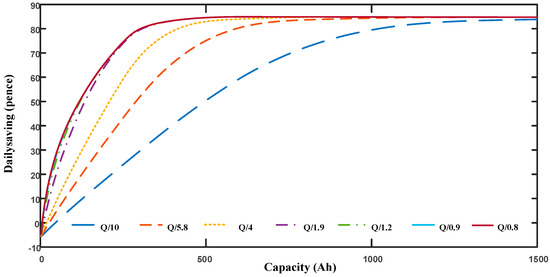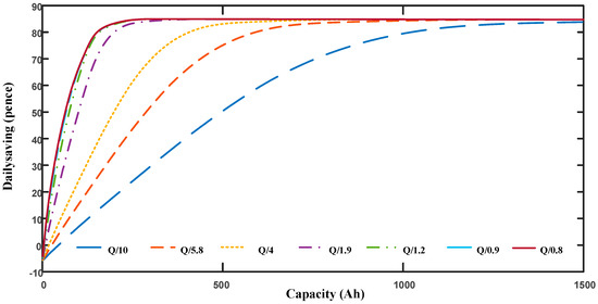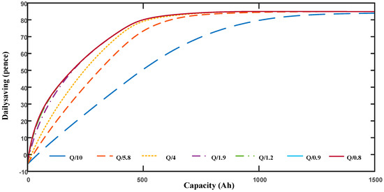 As mentioned in Section 4.2, to compensate maximum daily energy saving and battery operation cost, the following work will attempt to optimize the battery capacity when average daily energy saving is approximately 95% of its maximum value, which is 80 pence in Figure 5, Figure 6 and Figure 7. Table 3 is used to show the average daily cost of different discharge currents under light discharge scenarios.