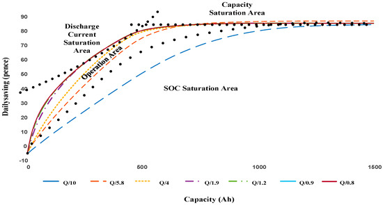 In Figure 7, when the discharge currents are higher than Q/1.9 and the battery capacities are higher than 216 Ah, the average daily saving is the same with different discharge currents. At this time, the best way to solve discharge current saturation is to decrease system minimum SOC. If system minimum SOC is decreased to 50%, the saturation value of discharge current becomes 259 Ah. Figure 8 shows the limitation of HESS operation. To make optimal use of the battery, an effective HESS should work in the operational area and avoid the saturation areas.