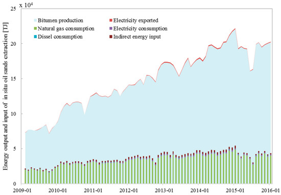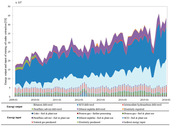 Indirect energy input intensity is calculated using the EIO model described in Section 2.2. Input-Output Tables of the Canadian economy were obtained from the Canadian Socio-Economic Information Management System (CANSIM) database of Statistics Canada (2009–2013) [32]. Since even the most detailed version (Level L) of the Input-Output table of Canada only offers data from the “Oil and Gas Extraction” sector, instead of data from the “oil sands extraction” sector, we were only able to obtain indirect energy intensity for the oil and gas extraction sector, rather than for the oil sands extraction sector through the EIO model. Therefore, in this paper, we used the indirect energy intensity of the oil and gas extraction industry to replace the indirect energy input intensity of the oil sands extraction sector. In addition, since the most recently available Input-Output Table is from 2011, we calculated indirect energy input intensity for the years before 2011 (including 2011) and used the same indirect energy input intensity of 2011 as that of the years following 2011. Production energy consumption (direct energy use) data for different sectors of the Canadian economy was also obtained from CANSIM, Statistics Canada (2016). After getting the indirect energy input intensity, we multiplied it with the monthly economic output of the oil sands extraction sector to get the monthly indirect energy input data. The economic output of the oil sands extraction sector is calculated by multiplying the unit price and the production of the two main products of oil sands extraction sector: bitumen and SCO. The price of bitumen and SCO is collected from Alberta Ministry of Energy [33].