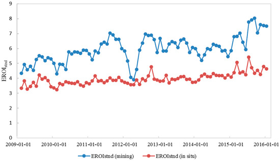 Generally, the EROIs of both mining COS and in situ COS display an upward trend over the past seven years, and the trend is especially obvious for mining COS during the period 2014–2015.