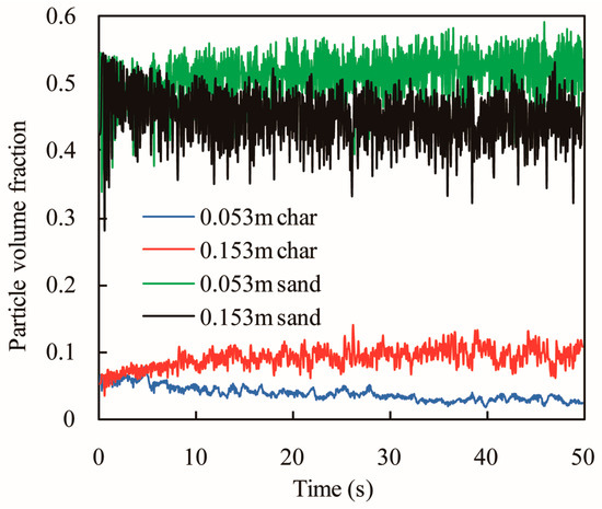 Bubbling fluidized beds are commonly used in industrial processes [1], such as combustion and gasification, due to their good mixing ability and heat transfer characteristic between the gas and solid phases. In the process of biomass gasification, the first step is pyrolysis. The gas component products after pyrolysis are non-condensable gases and tars, and char is left as a solid residue [2]. Due to the irregular shape and low density of char particles, it is difficult to attain a stable fluidization status. Generally, inert particles such as sand particles are added to the fluidized bed to improve the fluidization status and the heat transfer effect. During the process of fluidization, char particles will accumulate toward the top of the bed, whereas the inert particles will sink towards the bottom of the bed. Hence, segregation is a widespread phenomenon in a binary system of particles in a bubbling fluidized bed [3,4].