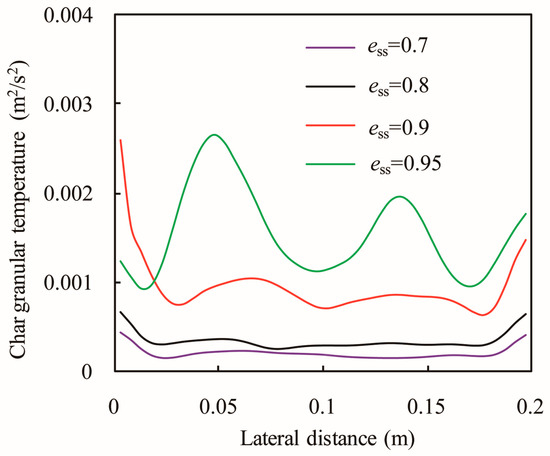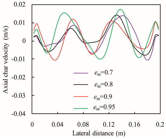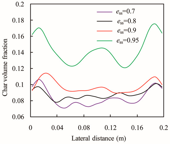 More studies [26,28] are concerned with the distribution characteristics of jetsam, however, in the gasification process, the flotsam will react with gas. Hence, the study on distribution characteristics of flotsam is much more significant. Lateral distributions of the time-averaged volume fraction of the flotsam at a height of 0.153 m are plotted in Figure 14. For ess = 0.7, 0.8, and 0.9, the effect of the restitution coefficient on the volume fraction of the flotsam is not obvious, hence, the profiles are very similar. However, when the restitution coefficient increases to 0.95, the values of volume fraction increase dramatically.